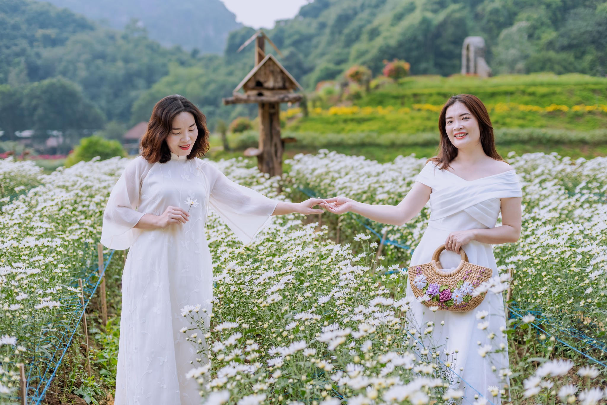 (PLVN) - Vườn cúc họa mi tinh khôi, trắng muốt đang nở rộ. Thu hút hàng nghìn du khách kéo đến "check in" tại vườn hoa trong Khu du lịch sinh thái Thung Nham.