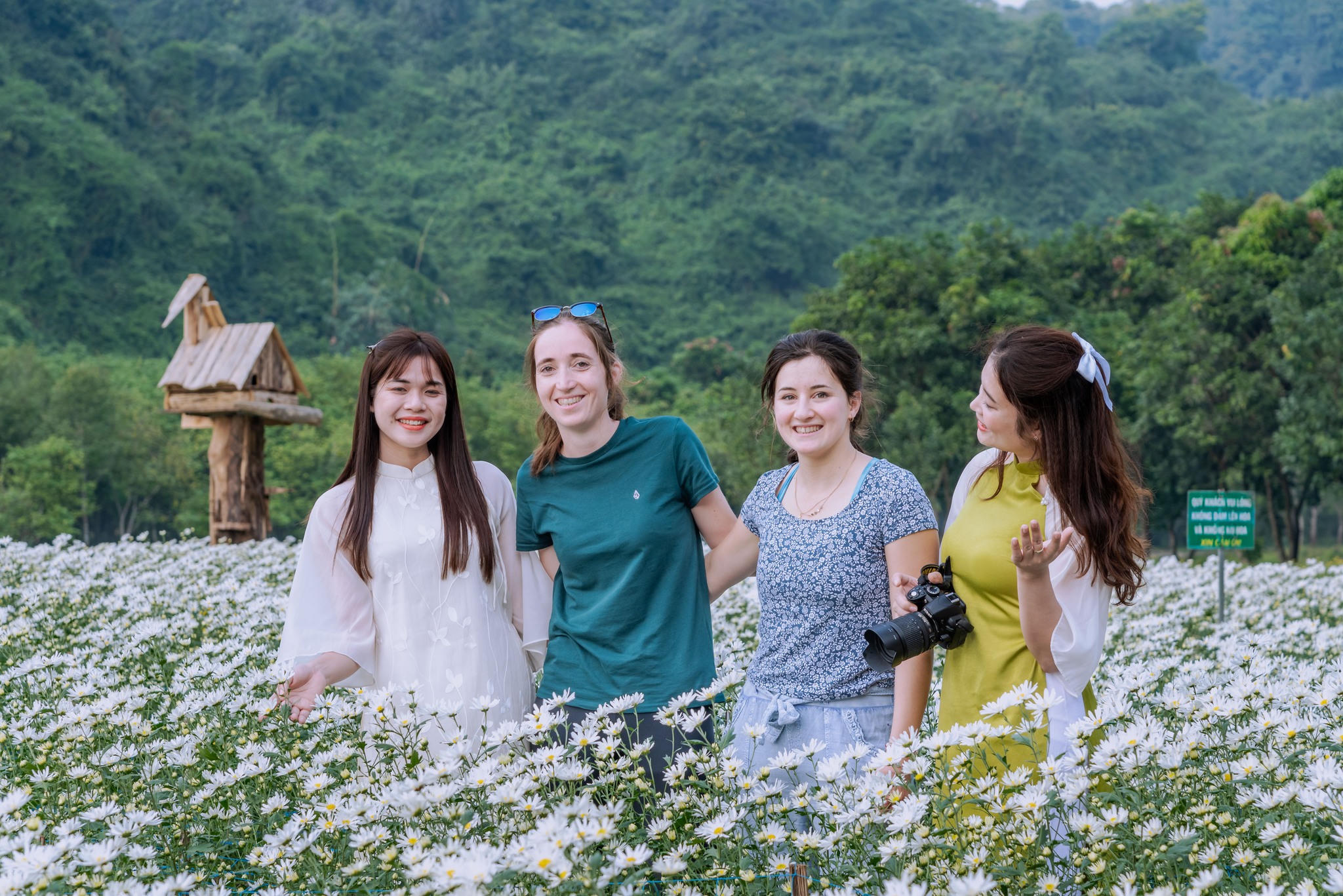 Du khách nước ngoài có nhiều trải nghiệm ấn tượng khi tham quan vườn hoa cúc họa mi tại Thung Nham. |