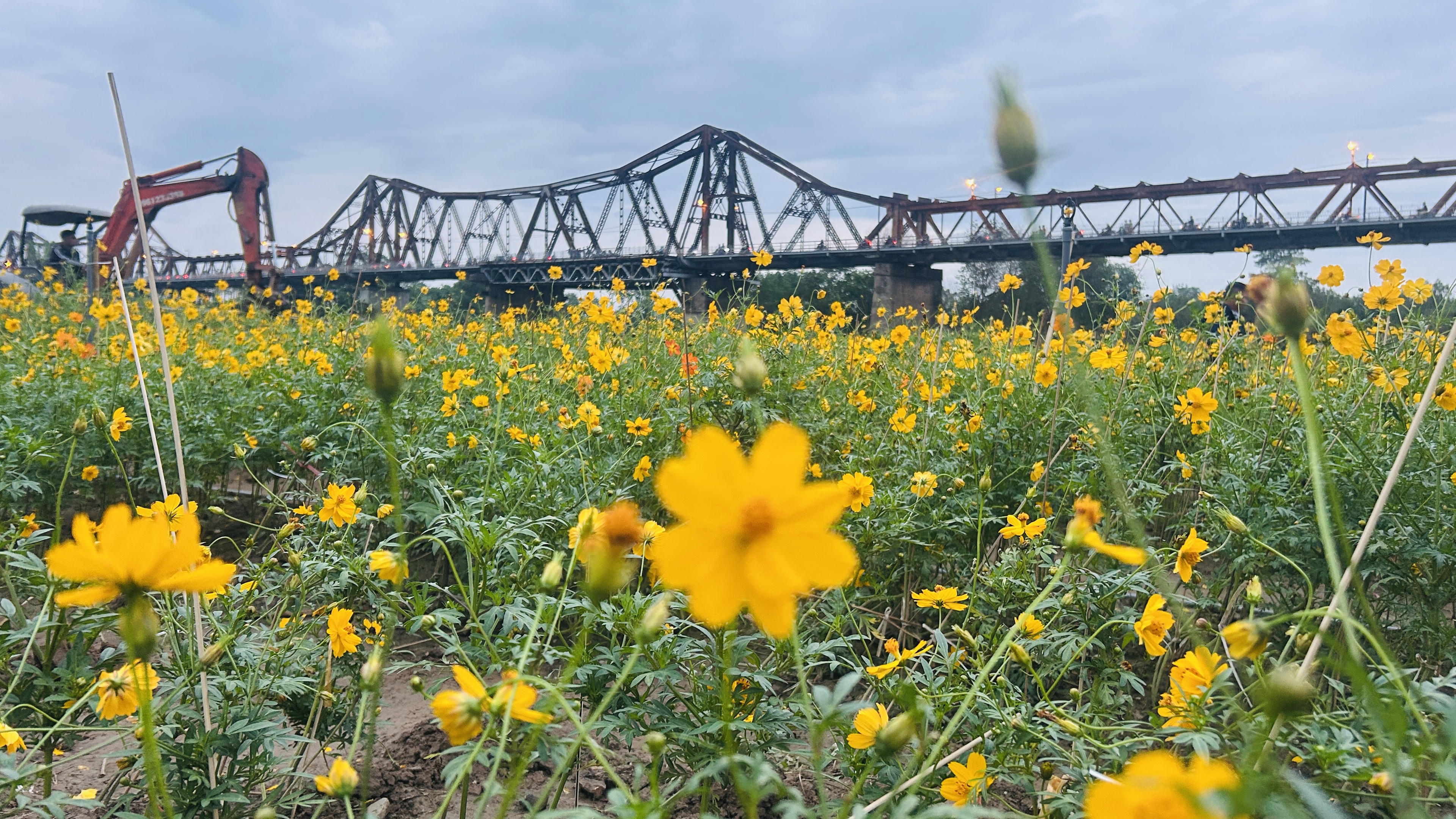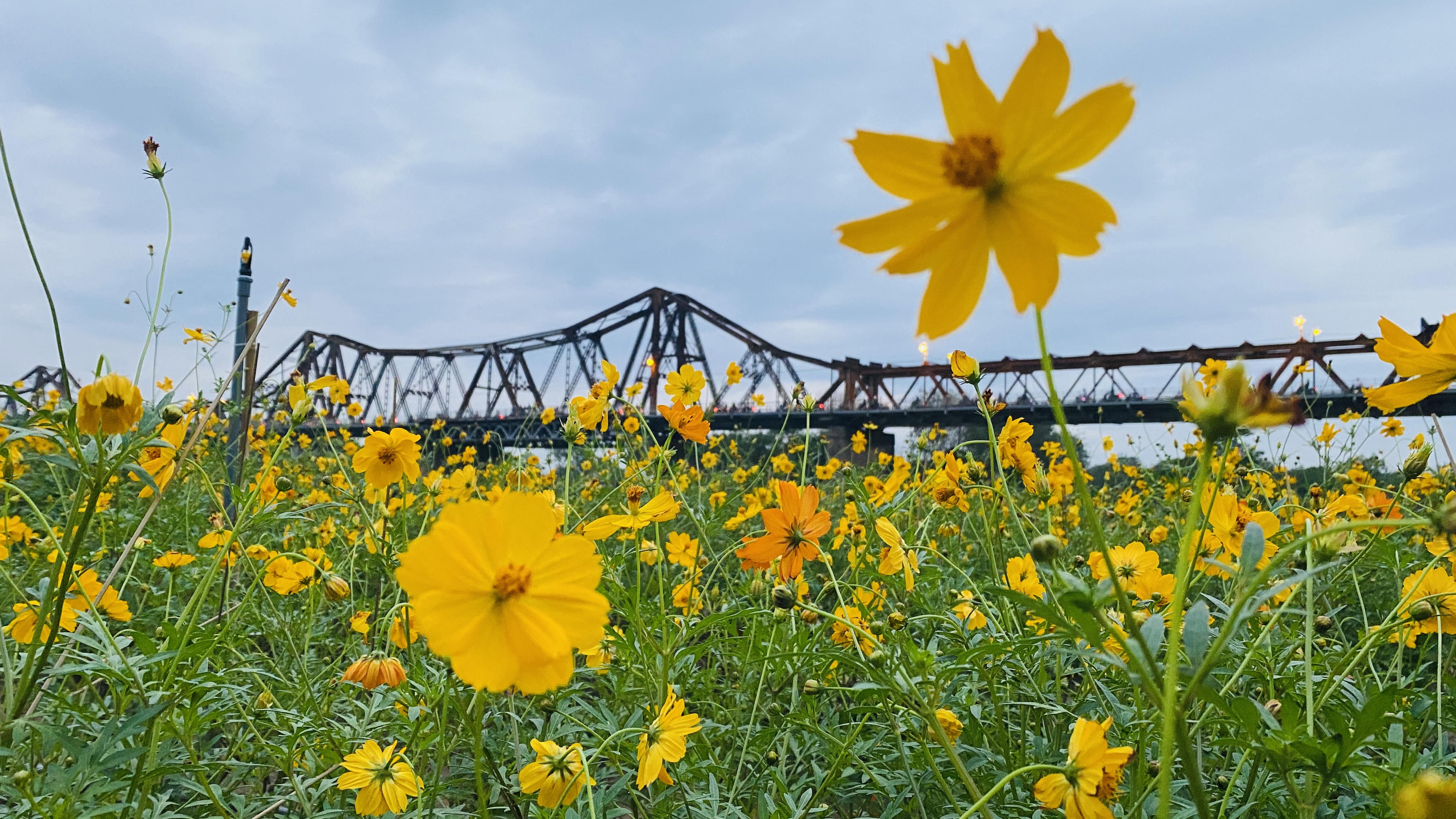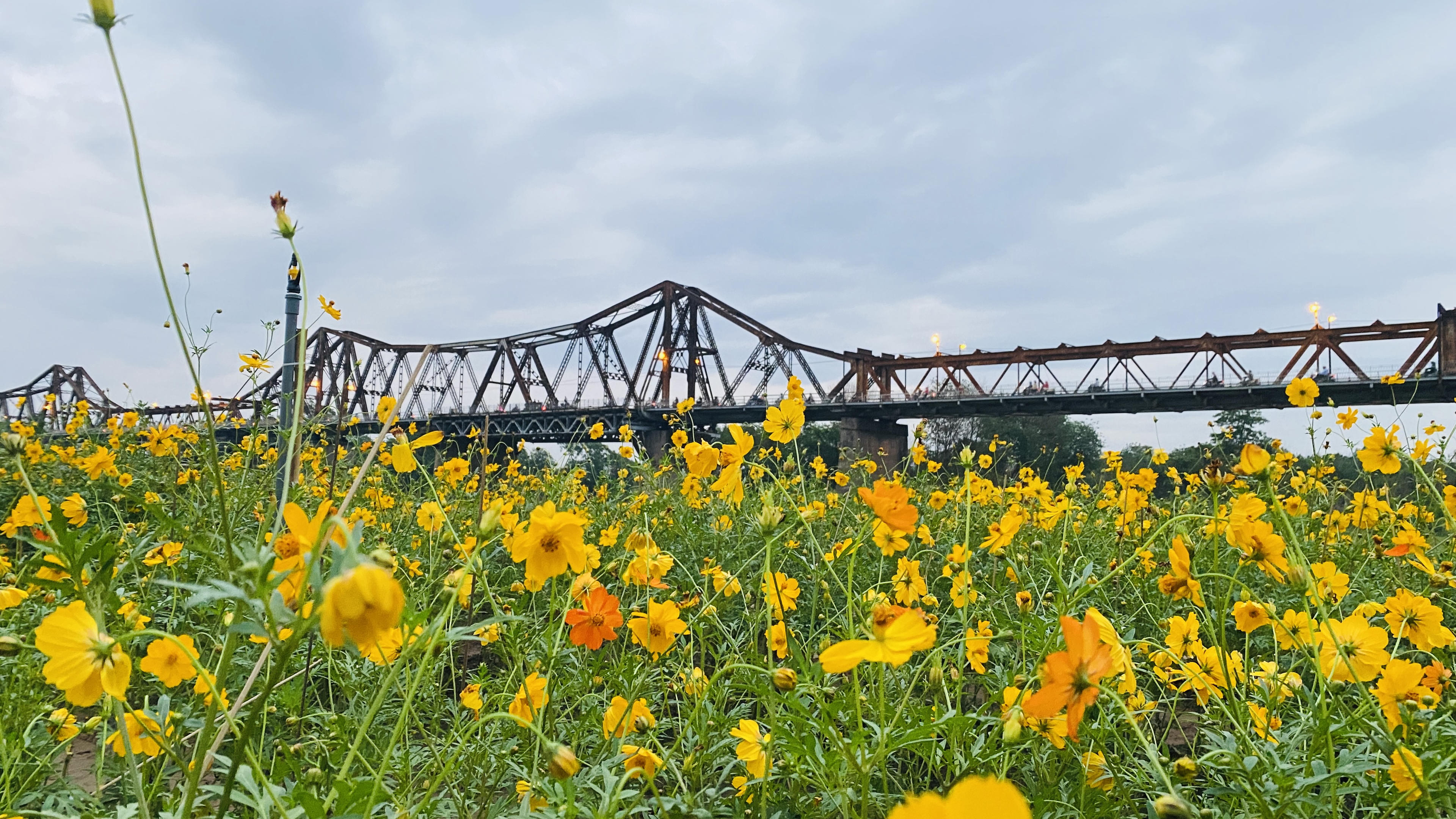 Khoảnh khắc cầu Long Biên lên đèn tuyệt đẹp nhìn từ cánh đồng cúc. |