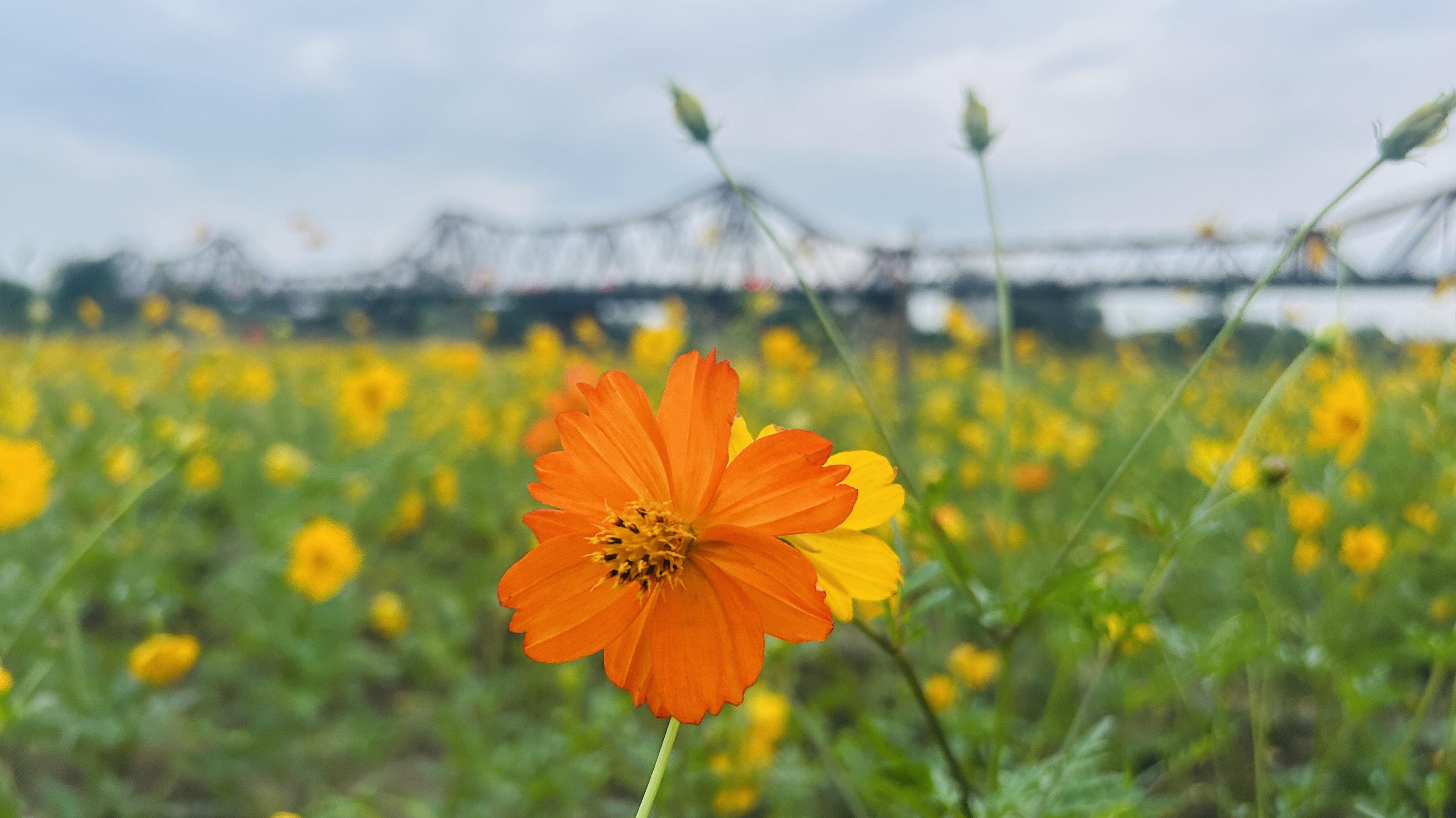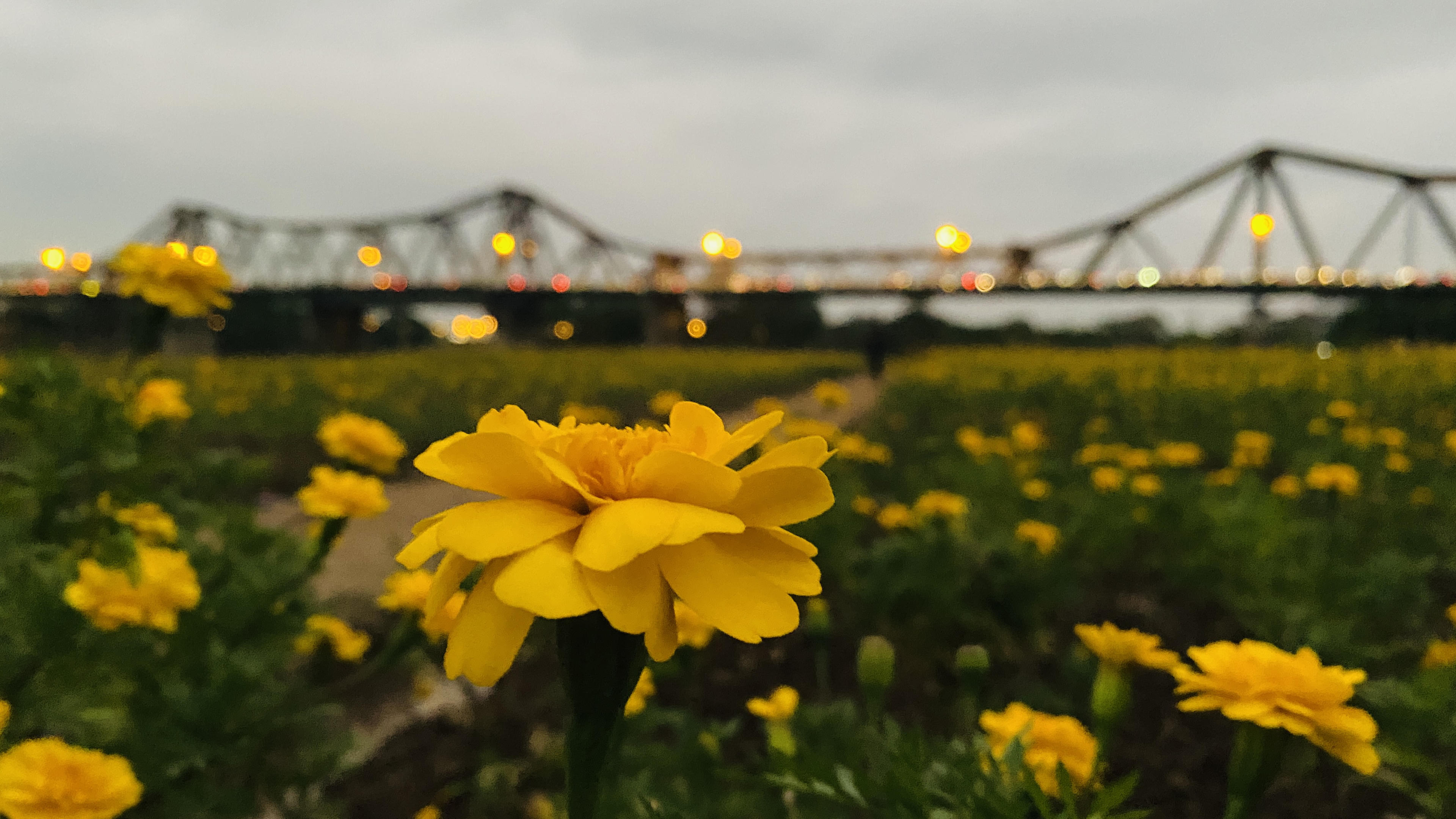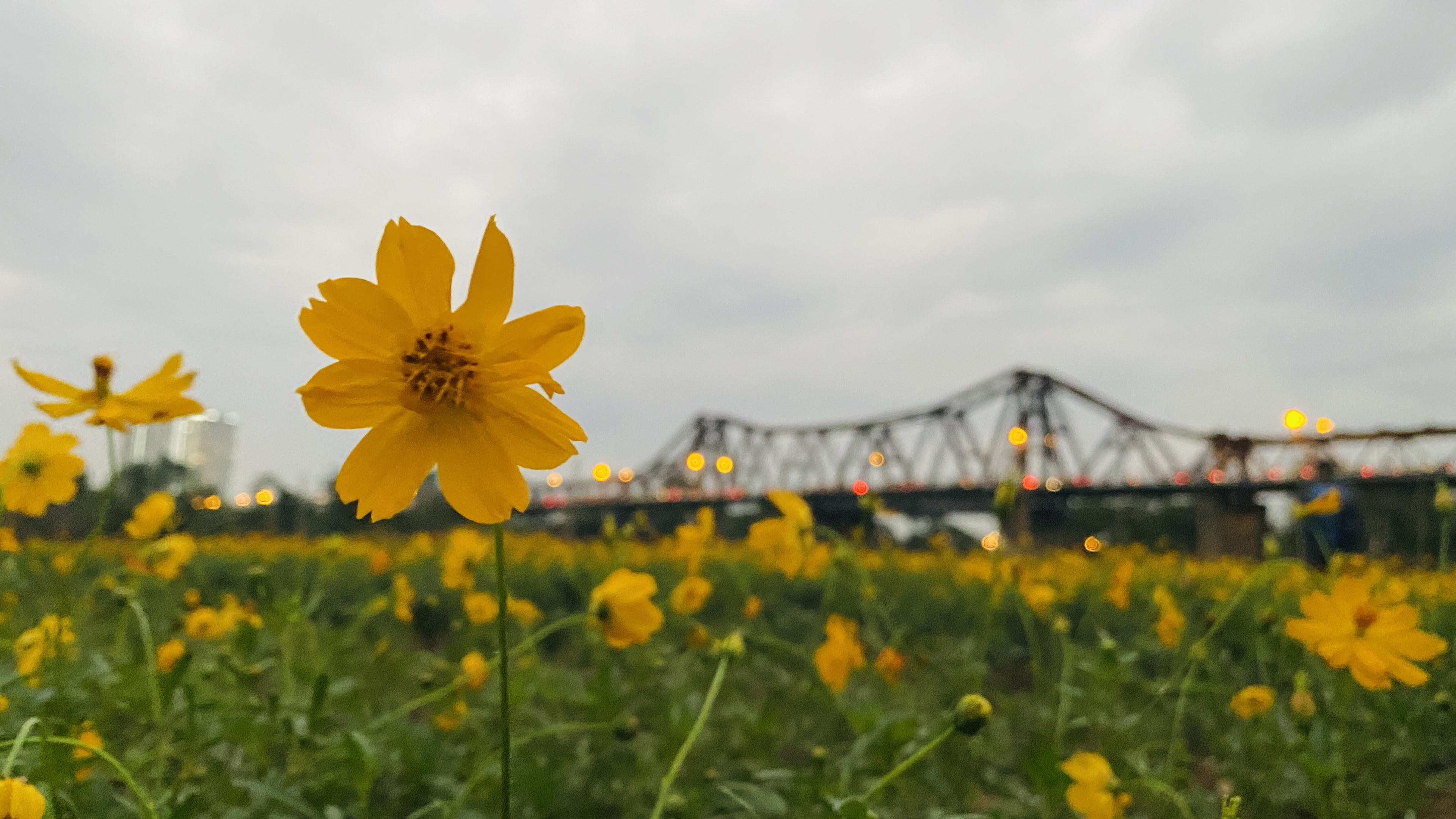 Khoảnh khắc cầu Long Biên lên đèn tuyệt đẹp nhìn từ cánh đồng cúc. |