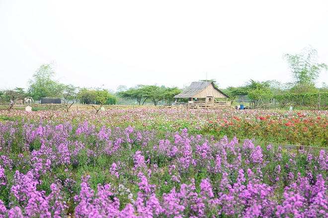 Ngoài tam giác mạch, vườn còn có các loài hoa cánh bướm, phăng-xê tím, hoa thạch thảo được trồng xen kẽ.