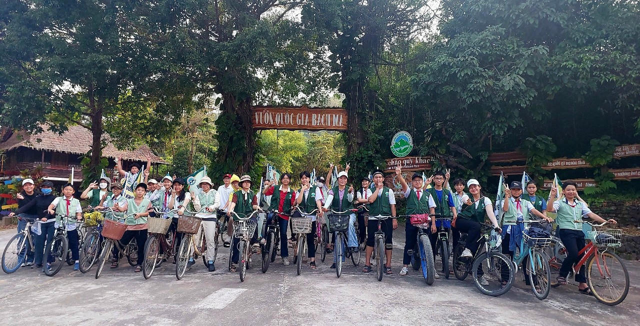 Thành viên CLB "Kiểm lâm viên nhí" đạp xe tuyên truyền bảo vệ rừng và phòng cháy chữa cháy rừng |