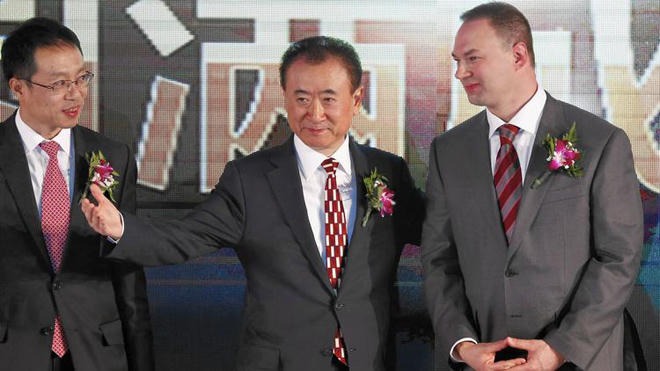 Vương Kiện Lâm (giữa) và Thomas Tull, người sáng lập và CEO của Legendary sau khi Tập đoàn Vạn Đạt mua cổ phần Legendary Entertainment với giá 3,5 tỷ USD.