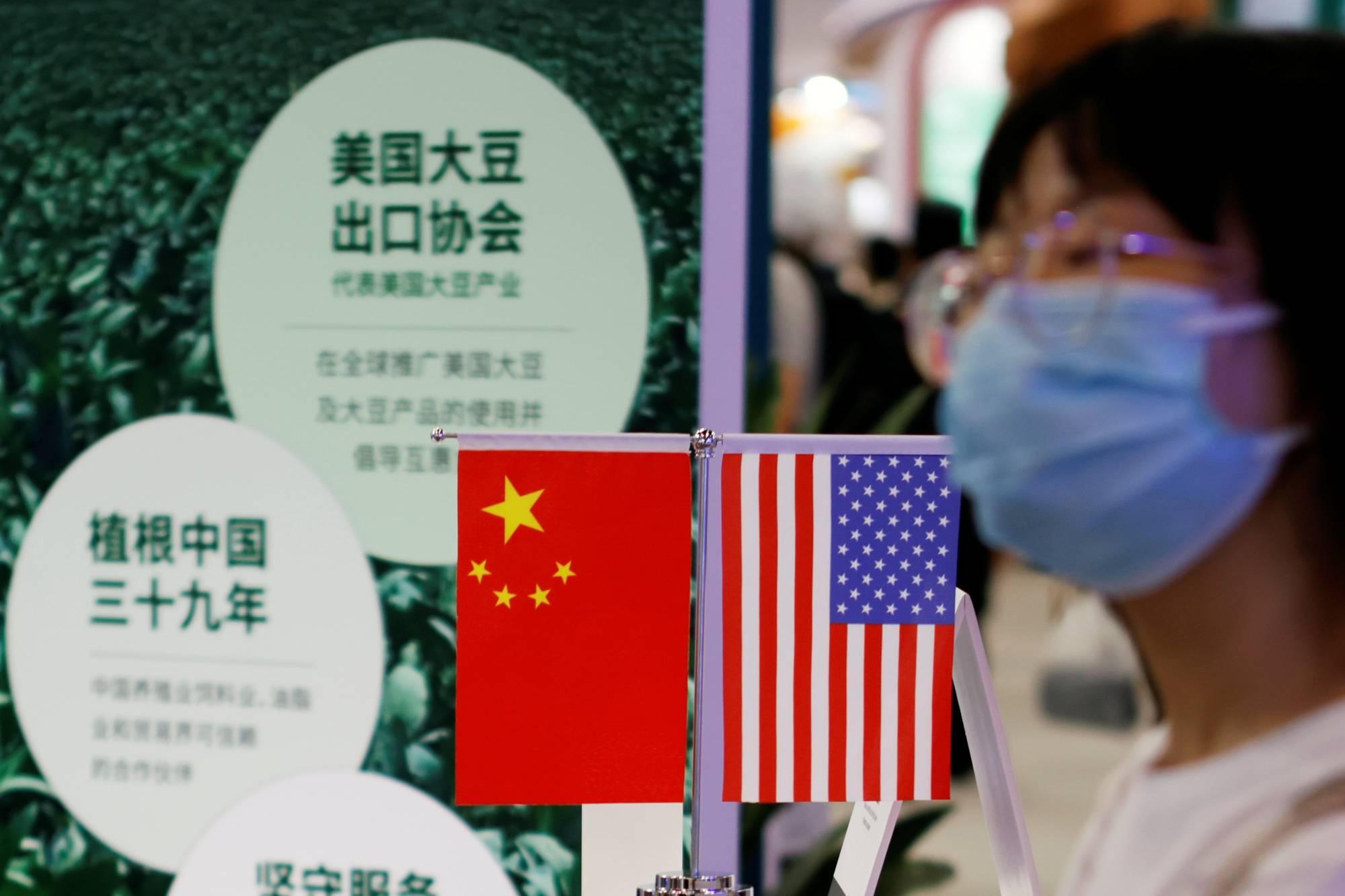Cờ của Trung Quốc và Hoa Kỳ được trưng bày tại gian hàng của Hội đồng Xuất khẩu Đậu nành Hoa Kỳ trong Hội chợ Thương mại Dịch vụ Quốc tế Trung Quốc năm 2021 diễn ra vào ngày 4/9. Ảnh; Reuters |