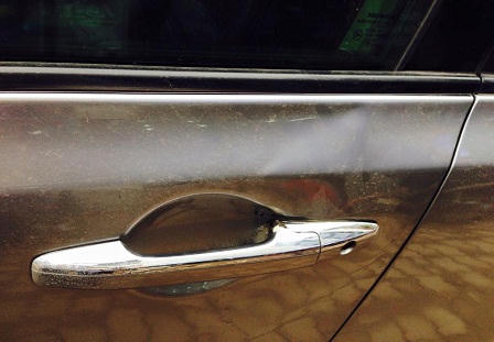 Bất ngờ một thanh xà beng dài khoảng 1m từ công trường trên cao rơi xuống lòng đường, va trúng vào cửa bên trái của ôtô. Va chạm khiến cho phần cửa gần tay mở ôtô bị móp vào.