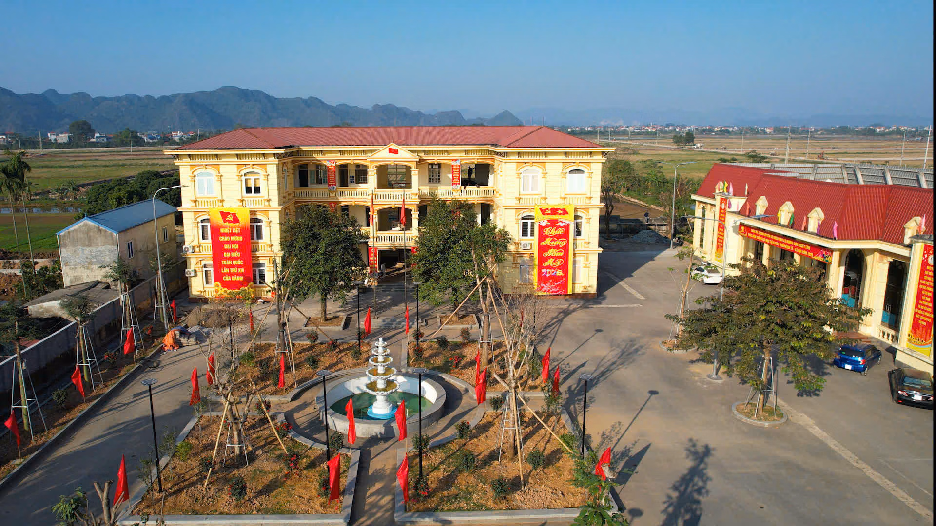 Tại khu vực trước trụ sở Đảng ủy, hệ thống pano, khẩu hiệu tuyên truyền cỡ lớn được lắp đặt nổi bật, trở thành điểm nhấn trong công tác tuyên truyền chào mừng Đại hội. Trụ sở HĐND, UBND xã và khu vực hành chính công được trang hoàng rực rỡ cờ hoa, thể hiện sự chuẩn bị chu đáo, nghiêm túc của địa phương.