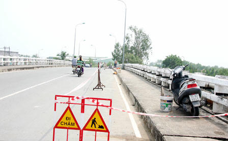 Nhận tin báo, quản lý cầu đường, công an cùng CSGT đường thủy đến lập biên bản. Sau khi ghi nhận, khám nghiệm hiện trường lực lượng chức năng tiến hành lập rào chắn ngăn các phương tiện có tải trọng lớn di chuyển qua đảm bảo an toàn.