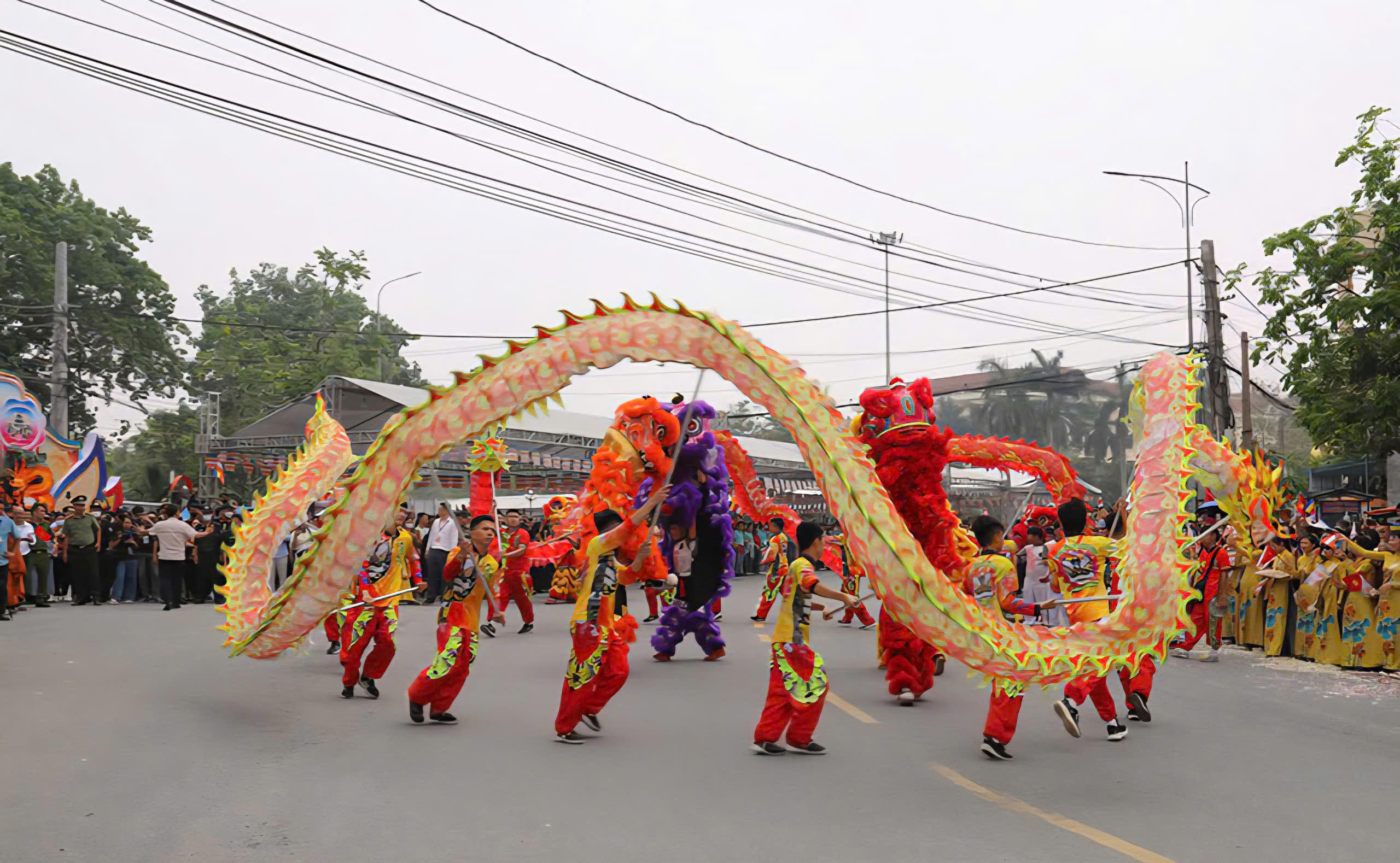 Hoạt động múa lân, múa rồng chào đón, cung nghinh Xá lợi Đức Phật.(ảnh Báo Hưng Yên) |
