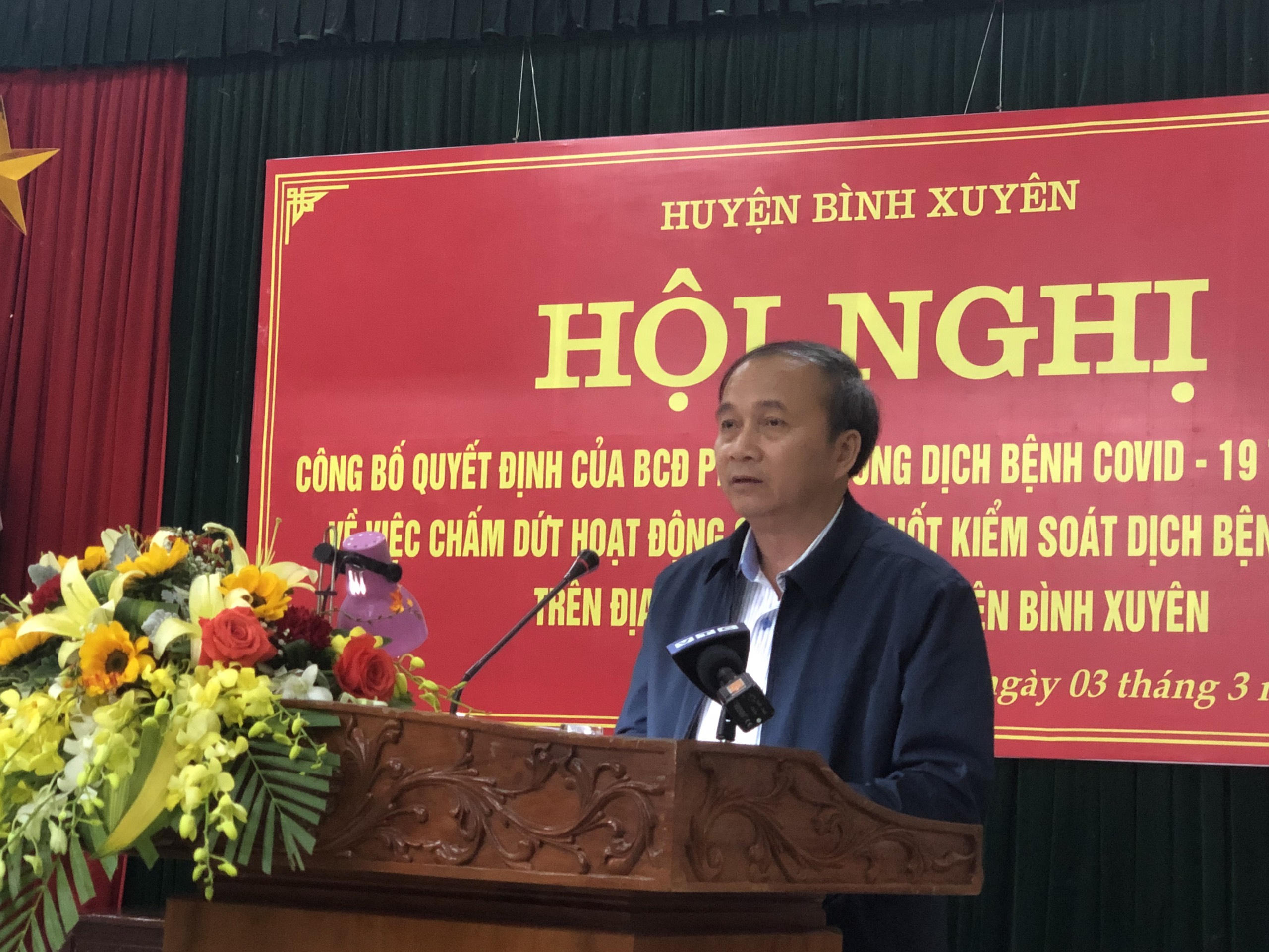 Thay mặt nhân dân toàn tỉnh, tôi xin được gửi lời cảm ơn đến các cấp, cơ quan chính quyền, Bộ Y tế đồng hành cùng nhân dân Vĩnh Phúc nói riêng, nhân dân Bình Xuyên nói chung để vượt qua thời gian vừa rồi."
