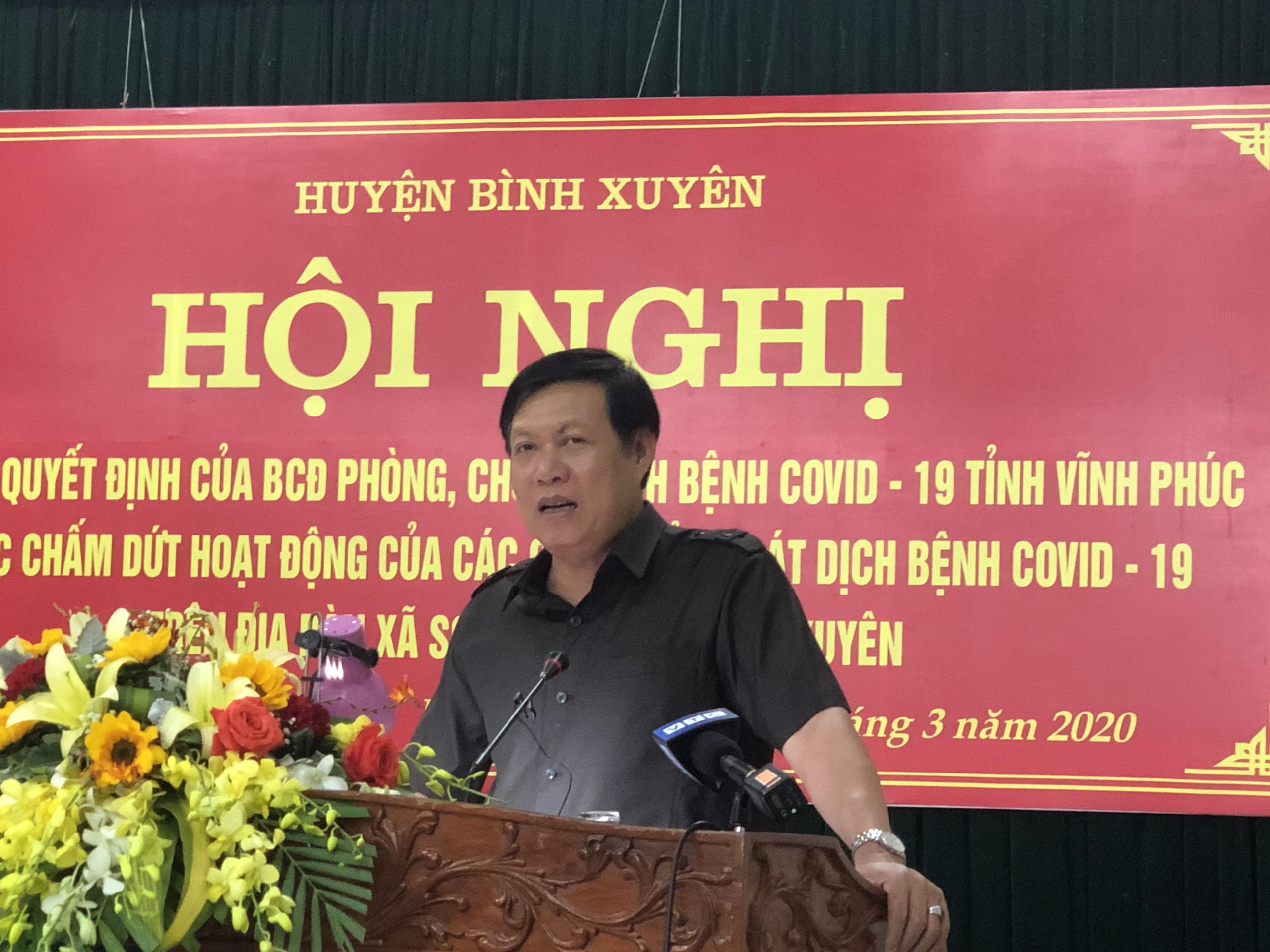 Ông Nguyễn Minh Chung, Chủ tịch UBND huyện Bình Xuyên cũng đã báo cáo về qúa trình diễn biến dịch Covid-19 trên địa bàn tỉnh Vĩnh Phúc. Theo báo cáo, Vĩnh Phúc có 11 người dương tính với COVID-19. Ngay từ ngày đầu UBND tỉnh đã chỉ đạo sát sao, thực hiện nghiêm túc việc điều trị, cách ly và phòng dịch ngay tại nhà. Toàn xã đã có 12 điểm chốt cách ly, Ban chỉ đạo huyện đã ban hành nhiều văn bản chỉ đạo, hướng dẫn tổ chức tuyên truyền đến người tác hại của dịch bệnh. BCĐ huyện đã tổ chức tập huấn các đoàn viên, thanh niên tham gia đội phòng tránh dịch. Các cán bộ thường trực tại các chốt đã trực 24/24h, giám sát chặt chẽ người dân, kiểm soát bệnh tật, vẫn tạo điều kiện cho người dân đi làm bình thường. Các nhu yếu phẩm đều được đảm bảo bình ổn giá để phục vụ người dân tránh tăng giá".