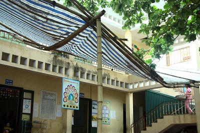Đưa chúng tôi lên Văn phòng nhà trường là mái vẩy bạt che tạm bợ như quán nước vỉa hè đã gãy gập, cô Đỗ Thị Chăm Hiệu trưởng Trường Mầm non Tam Đồng không giấu được vẻ ái ngại trước sự xuống cấp của cơ sở vật chất nhà trường.