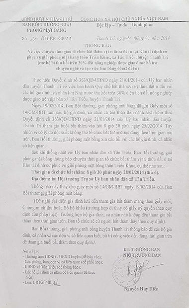 Ngày 19/2/2014, gia đình bà Thứ được Ban bồi thường GPMB huyện Thanh Trì mời ra để thông báo thủ tục bốc thăm nhận đất tái định cư dự kiến sẽ diễn ra vào ngày 25/2/2014. Nhưng đến ngày 21/2/2014 gia đình bà Thứ lại nhận được thông báo số 20/TB-BBT-GPMB thay đổi lịch tổ chức bốc thăm sang ngày 28/2/2014. Giống như điềm báo - bà Thứ tâm sự với chúng tôi - trục trặc nhỏ này đem lại cho bà linh tính về một việc chẳng lành.