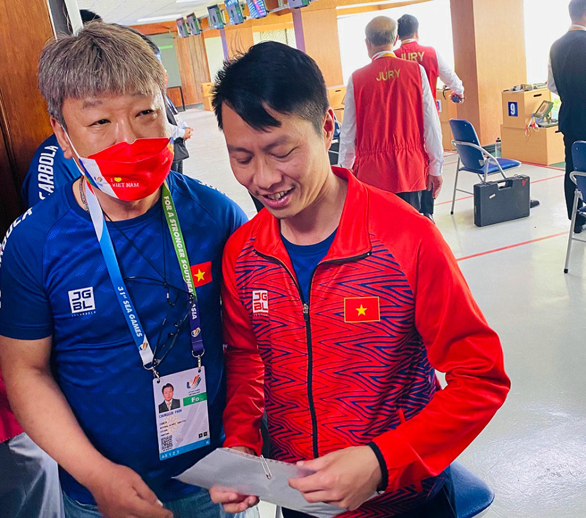 HLV Hoàng Xuân Vinh (phải) cùng học trò Phạm Quang Huy, xạ thủ vừa giành HC vàng môn bắn súng tại Asiad 19. (Ảnh Quý Lượng) |