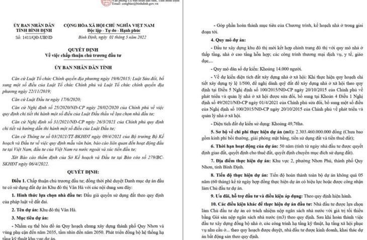Quyết định số 1411 của UBND tỉnh Bình Định về việc chấp thuận chủ trương thực hiện dự án Khu đô thị Vân Hà |
