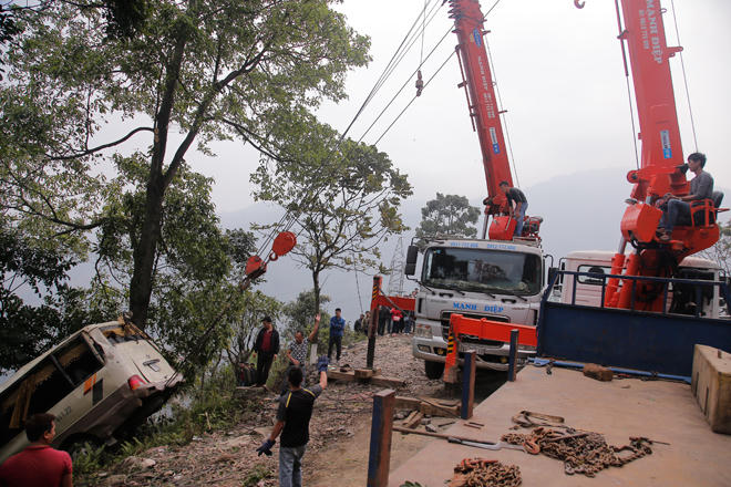| Lực lượng cứu hộ kéo xe gặp nạn khỏi hiện trường ngày 4-3. |