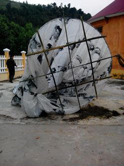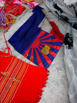 Sợi dây buộc quả cầu bằng nhựa dài khoảng 1km, đáng chú ý là cứ khoảng 0,5m buộc một chiếc khăn, 1 chiếc váy, 1 áo có hoa văn. Số lượng khăn, váy, áo khoảng 50 chiếc với nhiều màu khác nhau.