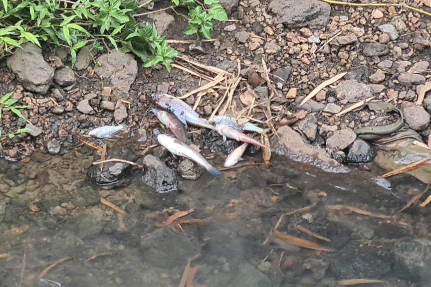 Cá chết chưa rõ nguyên nhân tại khu vực suối Bí. |