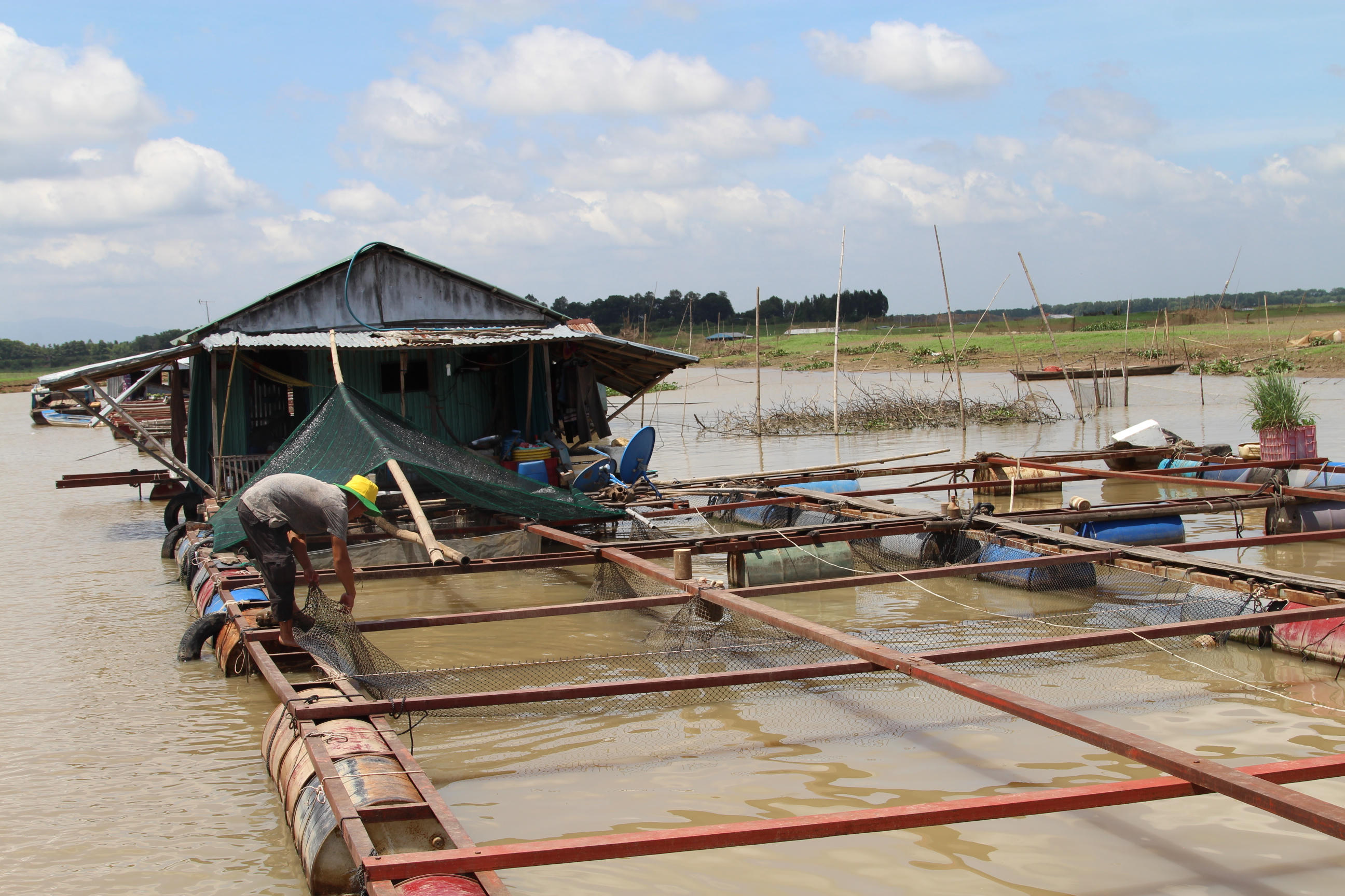 Cảnh tiêu điều hiện hữu khiến không khí u ám dường như nặng nề hơn giữa tháng 6. Loạt lồng cá giữa làng bè trên khúc sông bị bỏ hoang phế, ngư cụ vứt chỏng chơ rỉ sét, cả đoạn sông không một bóng người.