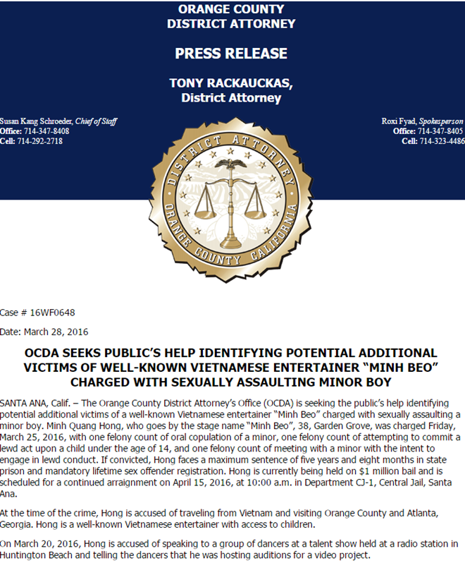 Ngày 28/3, Văn phòng Biện lý Quận Cam (OCDA) đăng thông cáo nêu rõ nghệ sĩ Minh Béo đang bị bắt vì xâm phạm tình dục trẻ em.