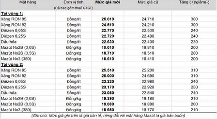 Sau quyết định này, Tập đoàn Xăng dầu Việt Nam (Petrolimex) đã tăng giá 300 đồng cho mỗi lít xăng RON 92, lên 24.510 đồng một lít. Đây cũng là mức bán ra tại các đơn vị thuộc Tổng công ty Xăng dầu Quân đội.. Tương tự, giá dầu diesel sẽ cộng thêm 240 đồng, lên 22.770 đồng. Mỗi lít dầu hỏa, dầu madút cũng lần lượt tăng giá 230 và 200 đồng một lít.
