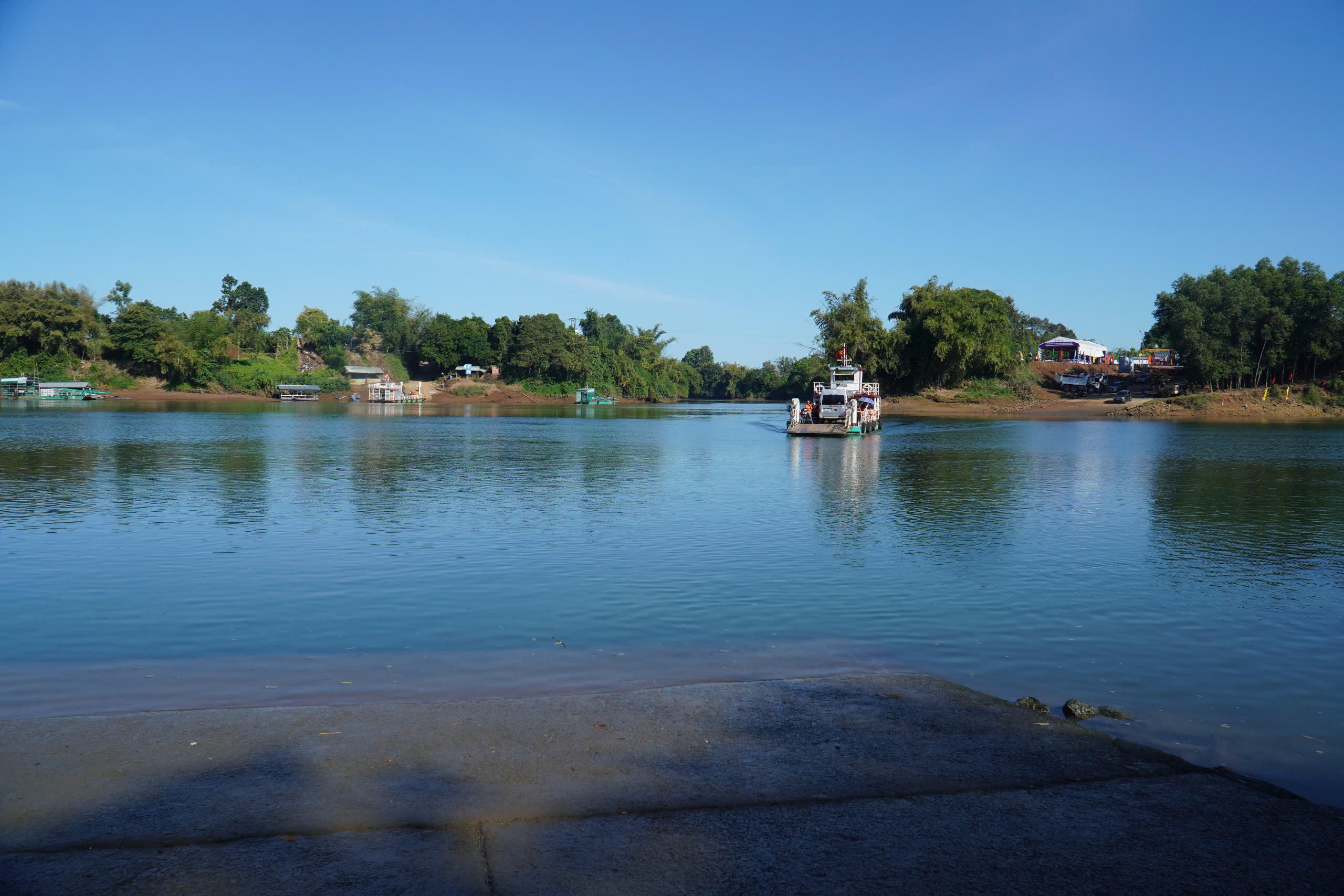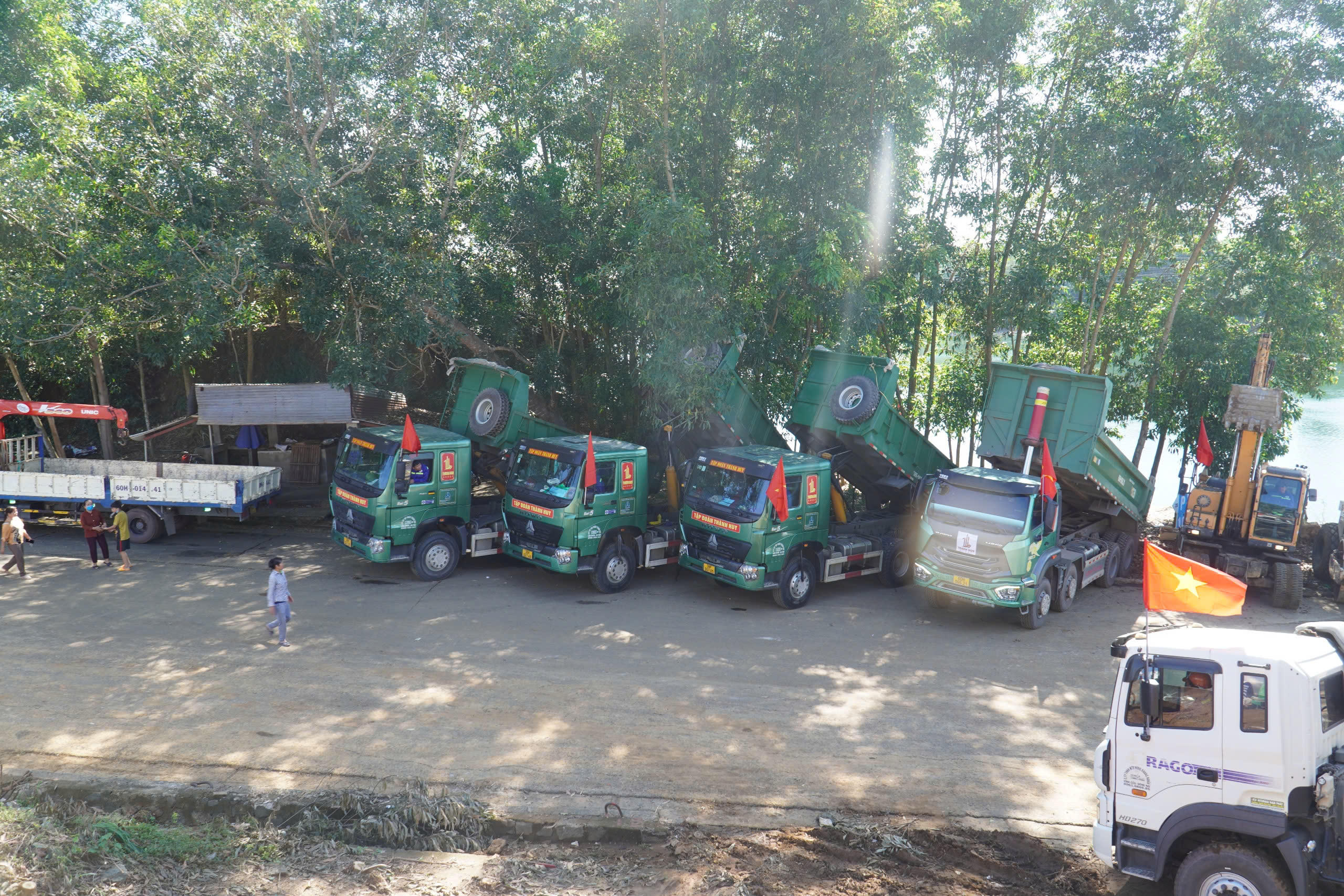 | Các phương tiện tập kết tại bờ sông Đồng Nai để phục vụ thi công |