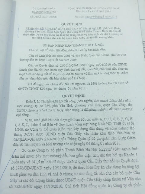 Sau hơn 2 năm dự án bị tạm dừng thi công và chờ tìm cách giải quyết kiến nghị của người dân, ngày 5/9/2014, UBND quận Cầu Giấy sau khi xem xét, đánh giá đã có Công văn số 791/UBND- QLĐT về việc tiếp tục cho Công ty Thanh Bình tiến hành xây dựng dự án. Trong công văn này nêu rõ: Dự án chung cư tại ngõ 259 phố Yên Hòa do Công ty Thanh Bình làm chủ đầu tư được TP cấp GPXD số 27/GPXD ngày 24/2/2012. Công trình đã thi công được phần móng và tầng hầm. Đề nghị Công ty Thanh Bình thực hiện đầu tư xây dựng công trình theo đúng GPXD được cấp và tuân thủ các quy định của pháp luật. “Danh chính ngôn thuận” là thế, nhưng không hiểu vì lý do gì mà khi phía chủ đầu tư cho thợ đến xây dựng lại một lần nữa vấp phải phản đối từ phía người dân khiến chủ đầu tư tiếp tục bị chậm tiến độ dự án và gây thiệt hại lớn cho doanh nghiệp. Lý do được xác định là người dân vẫn cho rằng công trình không đáp ứng quy chuẩn xây dựng.