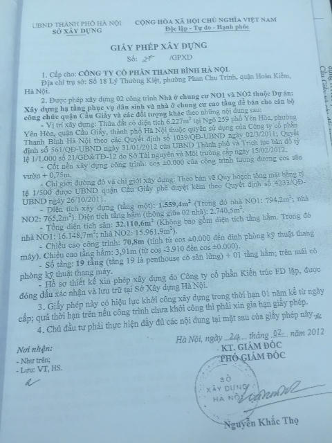 Sau khi có GPXD, ngày 24/2/2012, Công ty Thanh Bình đã có thông báo khởi công công trình theo GPXD số 27/GPXD ngày 24/2/2012 do Sở Xây dựng Hà Nội cấp; ngày khởi công 6/3/2012, dự kiến hoàn thành vào 14/10/2014 gửi UBND phường Yên Hòa và được chấp thuận. Tuy nhiên, ngay khi mới bắt tay vào triển khai xây dựng các hạng mục ban đầu, phía công ty đã vấp phải sự phản đối của các hộ dân tổ 24 phường Yên Hòa với lý do công trình không đáp ứng các quy chuẩn xây dựng. Và, UBND phường Yên Hòa đã có Công văn số 282/UBND ngày 18/12/2012 về việc xác nhận thời điểm tạm dừng thi công công trình. Vì vậy, từ tháng 5/2012 đến nay, Công ty Thanh Bình đã tạm dừng thi công dự án nêu trên để phối hợp với các cơ quan chức năng giải quyết các kiến nghị của người dân.