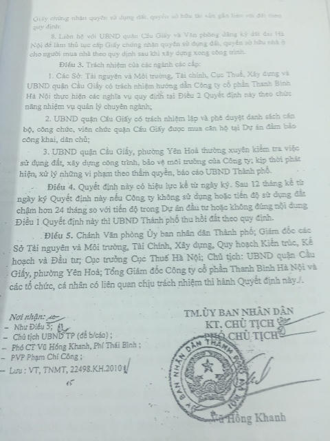 Về việc xây dựng dưới vỉa hè phía công trình thuộc dự án: Căn cứ theo Quyết định giao đất số 1039/QĐ-UBND ngày 2/3/2011 của UBND TP Hà Nội cho thấy dự án đang được thi công trong phạm vi ranh giới đất dự án đã được giao và thực hiện theo đúng GPXD đã được Sở Xây dựng cấp. Căn cứ hợp đồng thuê đất số 17/HĐTĐ ngày 17/1/2012 Sở Tài nguyên và Môi trường ký với Công ty Thanh Bình để thuê diện tích đất sử dụng tầng hầm ngoài phần công trình, từ thời điểm ký hợp đồng thuê đất cho đến nay công ty đã thực hiện nộp tiền thuê đất đầy đủ với Chi Cục thuế quận Cầu Giấy. Công ty Thanh Bình cam kết sẽ hoàn trả nguyên trạng 2m vỉa hè bên phía công trình thuộc dự án ngay sau khi hoàn thất xây dựng phần tầng hầm.