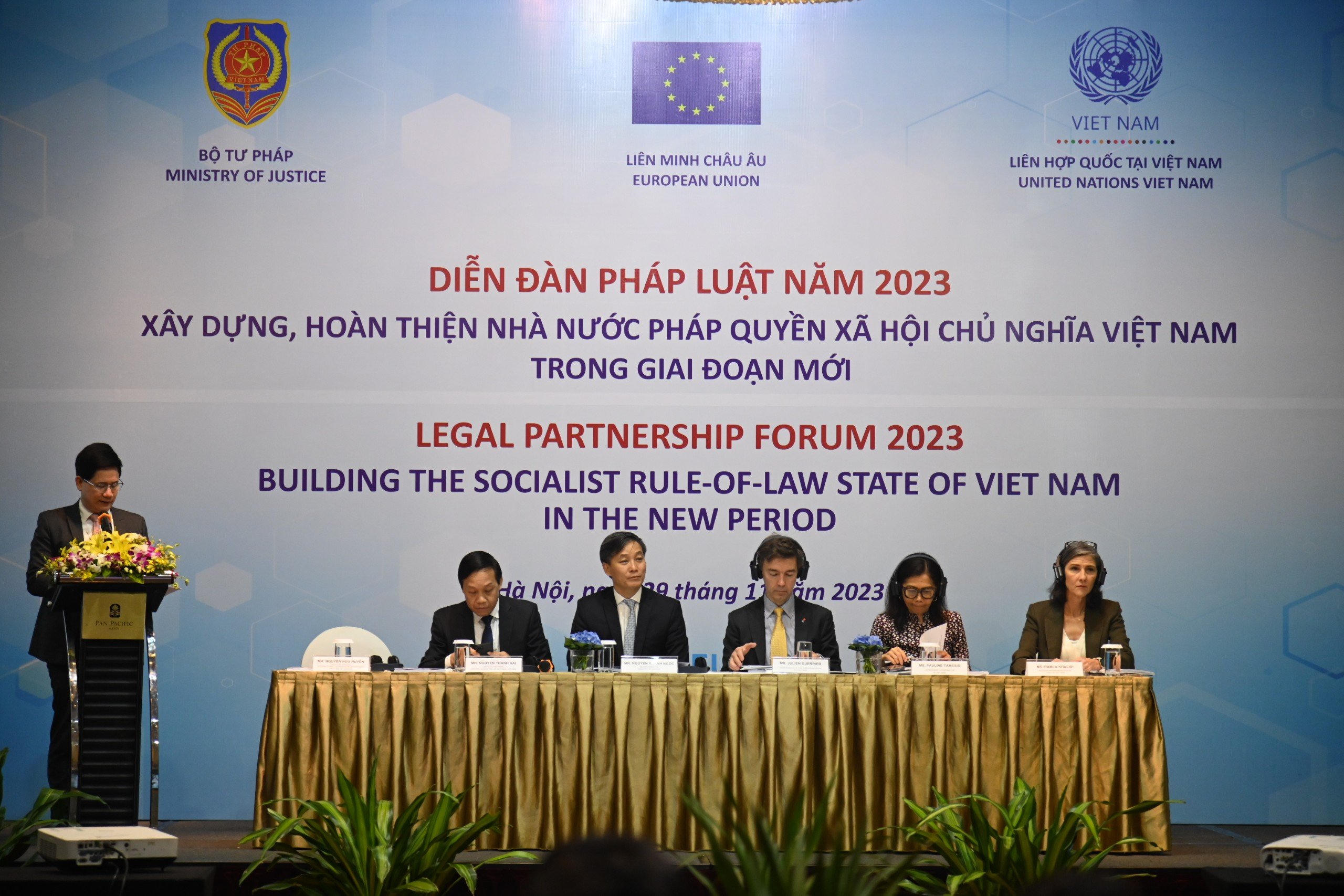 Đồng chủ trì Diễn đàn pháp luật là Thứ trưởng Bộ Tư pháp Nguyễn Khánh Ngọc, Phó Trưởng Ban Nội chính Trung ương Nguyễn Thanh Hải, Vụ trưởng Vụ Hợp tác quốc tế, Bộ Tư pháp Nguyễn Hữu Huyên, Đại sứ Phái đoàn Liên minh châu Âu tại Việt Nam Julien Guerrier, Điều phối viên thường trú Liên hợp quốc tại Việt Nam Pauline Tamesis.