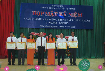 Tại lễ họp mặt, nhiều tập thể và cá nhân có thành tích xuất sắc trong quá trình thành lập và phát triển của trường vinh dự được tặng Bằng khen của Bộ trưởng Bộ Tư pháp và Chủ tịch UBND tỉnh Hậu Giang. Đại diện Công ty Suntory Pepsico Việt Nam cũng trao quỹ tài trợ 50 suất học bổng (mỗi suất 1 triệu đồng) cho học sinh vượt khó của trường. Dịp này, Trường Trung cấp Luật Vị Thanh cũng tổ chức trao giải Hội thi giáo viên dạy giỏi các trường Trung cấp Luật thuộc Bộ Tư pháp năm 2015.