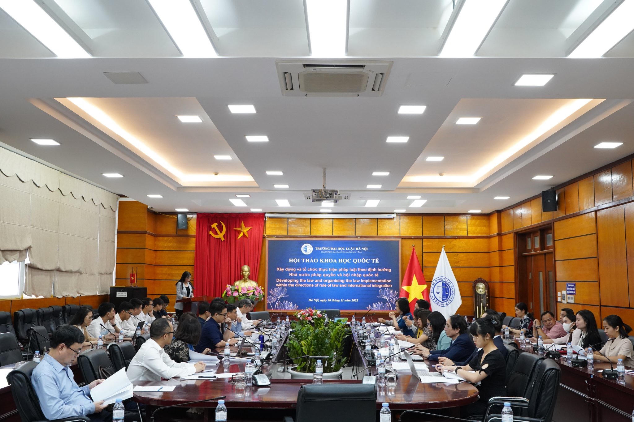 Tại Hội thảo, các đại biểu tham dự đã tập trung vào một số nội dung: Nghiên cứu các vấn đề lý luận và thực tiễn về xây dựng, tổ chức thực hiện pháp luật; nhận diện các yêu cầu cơ bản đối với quá trình xây dựng và tổ chức thực hiện pháp luật theo định hướng nhà nước pháp quyền và hội nhập quốc tế; phân tích, đánh giá mức độ đáp ứng các yêu cầu đó của hệ thống pháp luật quốc gia; đề xuất, kiến nghị các giải pháp hiệu quả nhằm xây dựng và tổ chức thực hiện pháp luật quốc gia theo định hướng nhà nước pháp quyền và hội nhập quốc tế…