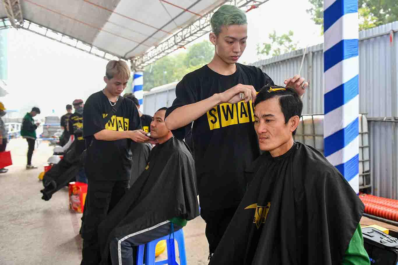 Những người công nhân cắt tóc, tân trang để đón Tết thêm tươm tất. . (Ảnh Thế Đại) |