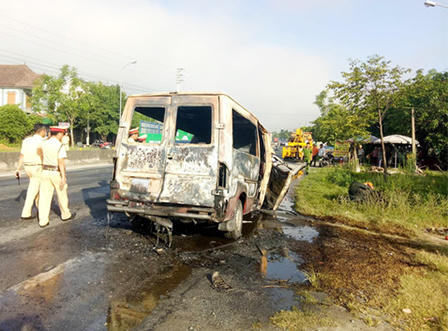 Tuy nhiên, khi ra khỏi hiện trường một đoạn thì xe ô tô 16 chỗ bất ngờ bốc cháy dữ dội. Ngọn lửa nhanh chóng bao trùm toàn bộ chiếc xe.