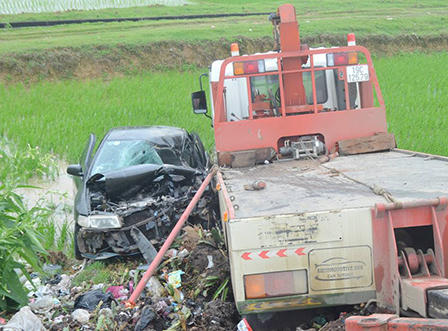 Tại hiện trường, phần đầu chiếc xe ô tô 4 chỗ nát bét, cả hai xe hư hỏng nặng. Nhiều mảnh kính vỡ rơi vãi trên đường và ruộng lúa.