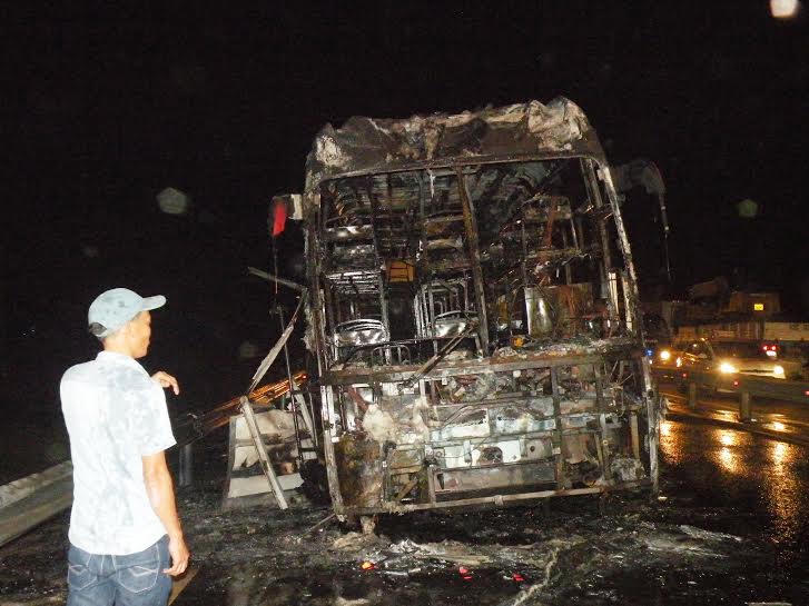 Tại hiện trường, chiếc xe bị cháy trơ khung, toàn bộ hàng hóa và hành lý của hành khách bị lửa thiêu rụi. Hàng chục hành khách và người của nhà xe vẫn chưa hết bàng hoàng.