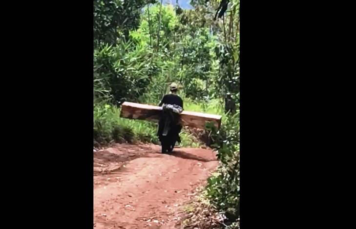Dù PV có đưa điện thoại ra ghi lại hình ảnh đoàn xe độ chế đang chở gỗ nhưng các “lâm tặc” này vẫn ngang nhiên hoạt động như chưa từng nhìn thấy ai. Lúc này, có mưa nên đường bắt đầu trơn trượt lại gặp những con suối nhỏ, vì thế việc vận chuyển gỗ ra ngoài bằng xe máy gặp khó khăn. Chính việc đó đã giúp cho phóng viên có thể ghi hình một cách đầy đủ về những khối gỗ được “lâm tặc” vận chuyển ra khỏi rừng.