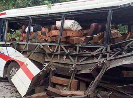Chiếc xe chở ít nhất 12 hành khách bị sập hoàn toàn, các cửa kính vỡ văng khắp nơi. Tại hiện trường phát hiện nhiều khúc gỗ xếp trên xe vung vãi ra ngoài và có cả xác pháo.