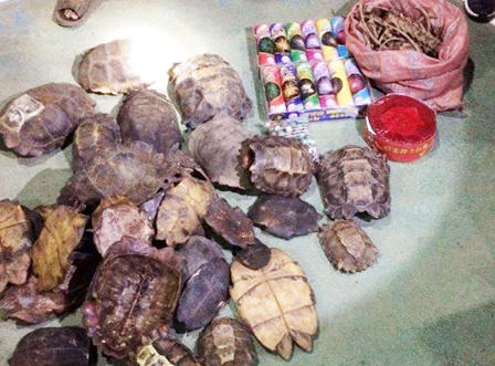 Khoảng 23h hôm qua, phát hiện xe tải BKS 37C - 218.00 đang lưu thông trên Quốc lộ 48 đoạn thuộc xã Đông Hiếu, TX. Thái Hòa có nhiều đặc điểm nghi vấn như người dân phản ánh đã dừng phương tiện kiểm tra. Trên xe có chở 42 thanh gỗ xẻ nghi gỗ Đinh Hương; gần 1 kg pháo các loại, 11 kg sản phẩm động vật (nghi mai rùa) và khoảng 2.000 kg sắt phế liệu.