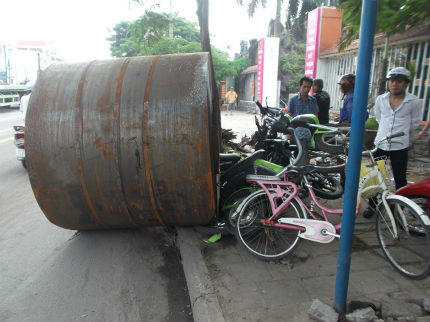Nghiêm trọng hơn, vụ tai nạn đã khiến cho 2 cuộn thép (mỗi cuộn có trọng lượng 2,4 tấn) tuột đứt xích văng ra. Một cuộn lao lên cabin đè bẹp cabin khiến anh Nguyễn Ngọc Sơn bị thương nặng. Cuộn còn lại văng xuống đường khoảng 20 mét đè bẹp 2 xe đạp điện và 4 xe máy đang đỗ trên vỉa hè. Ngoài ra bình xăng và một số bộ phận của chiếc xe container cũng văng tung tóe ra đường. Rất may đã không có ai bị những vật thể trên gây thương tích.