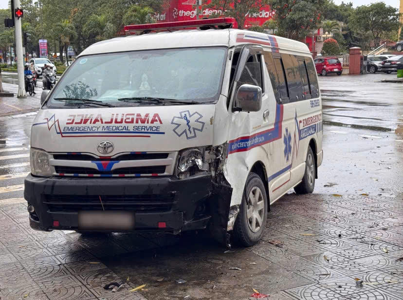 Tại hiện trường, xe cứu thương lao lên vỉa hè, đầu xe bị móp. Riêng xe ô tô con bị hư hỏng nặng phần đầu. Rất may không có thiệt hại về người.