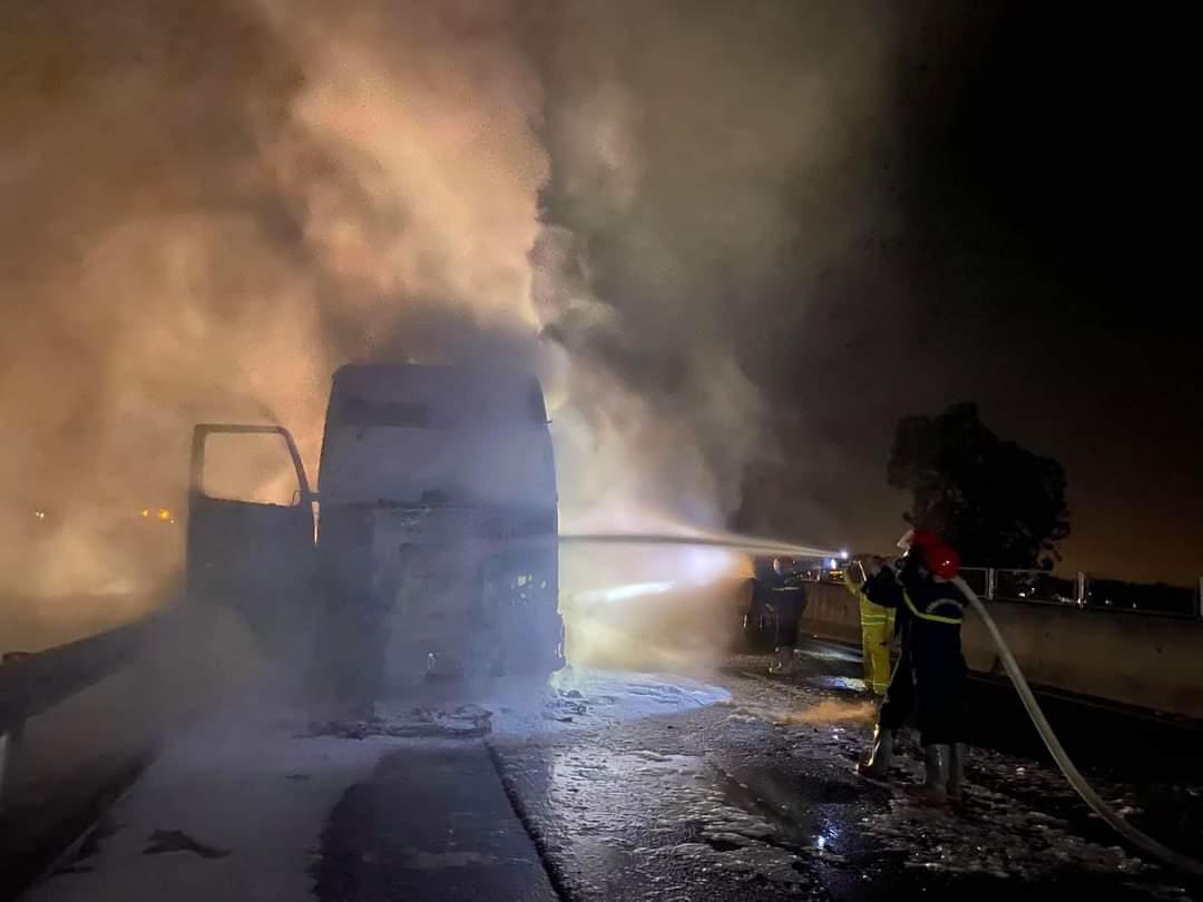 Khi đến Km số 7 trên cao tốc Đà Nẵng - Quảng Ngãi thì tài xế phát hiện khó và lửa bốc ra từ lỗ máy lạnh trên xe nên đã mở cửa thoát thân. Thời điểm này, ngọn lửa nhanh chóng lan rộng và bao trùm cả chiếc xe đầu kéo.