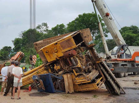 Cú đâm mạnh, khiến chiếc xe đầu kéo lao thẳng xuống ruộng, trên rơ mooc chở theo hai chiếc máy múc lật rơi xuống nằm chắn ngang đường Hồ Chí Minh làm ách tắc giao thông.