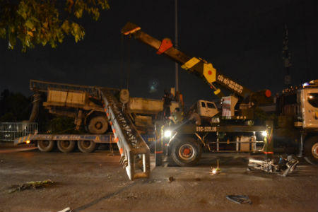 (PLO) - Khoảng 2h30 ngày 8/9, chiếc xe đầu kéo chở một xe tải cỡ lớn kéo đổ thanh chắn giới hạn nặng gần chục tấn trên quốc lộ 1, đoạn gần cầu vượt Quang Trung, quận 12, TP. Hồ Chí Minh khiến 4 phương tiện khác gặp nạn, một người tử vong.