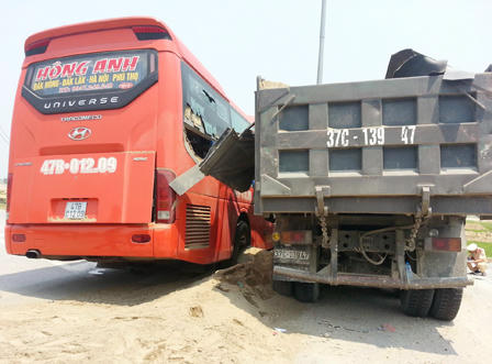 Khoảng 11h30 phút trưa ngày 8/5, anh Nguyễn Thúc Tám (SN 1974, trú xã Phong Thịnh, Thanh Chương, Nghệ An) điều khiển chiếc xe tải mang BKS: 37C-139.47 do chở cát lưu thông trên Quốc lộ 46B hướng Nam Đàn - TP. Vinh. Khi đi đến ngã tư đường tránh TP.Vinh giao với Quốc lộ 46B, đoạn qua địa bàn xã Hưng Tây (Hưng Nguyên, Nghệ An) thì xảy ra va chạm với chiếc xe khách giường nằm BKS: 47B-012.09 do tài xế Trương Văn Hòa (SN 1974, trú TP. Buôn Ma Thuột, Đắk Lắk) điều khiển chạy theo hướng Bắc - Nam.