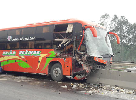 Lúc này, ô tô khách giường nằm BKS 37B -00345 đang chạy cùng chiều với tốc độ khá nhanh phía sau không kịp xử lý nên tài xế đánh lái lao vào giải phân cách giữa đường để tránh đuôi xe container.