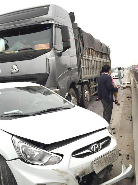 Cú va chạm làm chiếc xe con quay ngang đường, xe “hổ vồ” tiếp tục chồm lên đẩy chiếc xe con thêm một đoạn dài mới chịu dừng lại. Tại hiện trường, chiếc xe con bị đâm bẹp phần đuôi, phần đầu xe húc vào giải phân cách bị hư hỏng, hai người trên xe con may mắn thoát chết.