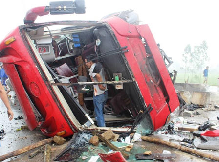 Tại hiện trường, chiếc xe khách bị hư hỏng gần như hoàn toàn, một loạt tấm bê tông dải phân cách giữa bị ủi bay, hiện trường có nhiều vết máu, đồ đạc hành lý của người dân vương vãi trên Quốc lộ.