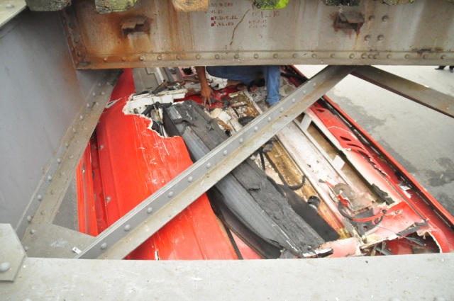 Tại hiện trường, phần máy điều hòa trên trần xe khách bị vỡ vụn do va chạm với các thanh ngang của cầu Long Biên. Lái xe và phụ xe đang cố gắng khắc phục sự việc.