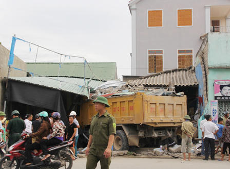 Hậu quả, khoảng 10m tường bị đổ sập, nhiều bàn ghế, bát đũa, xe máy trước quán bún bị xe cuốn vào gầm. Phần đầu xe tải hư hỏng nặng, tài xế rời khỏi hiện trường ngay sau đó.