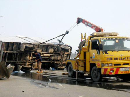 Cơ quan chức năng quận 9 lập biên bản, ghi nhận vụ việc, đưa xe cứu hộ đến dời xe tải ra khỏi hiện trường.